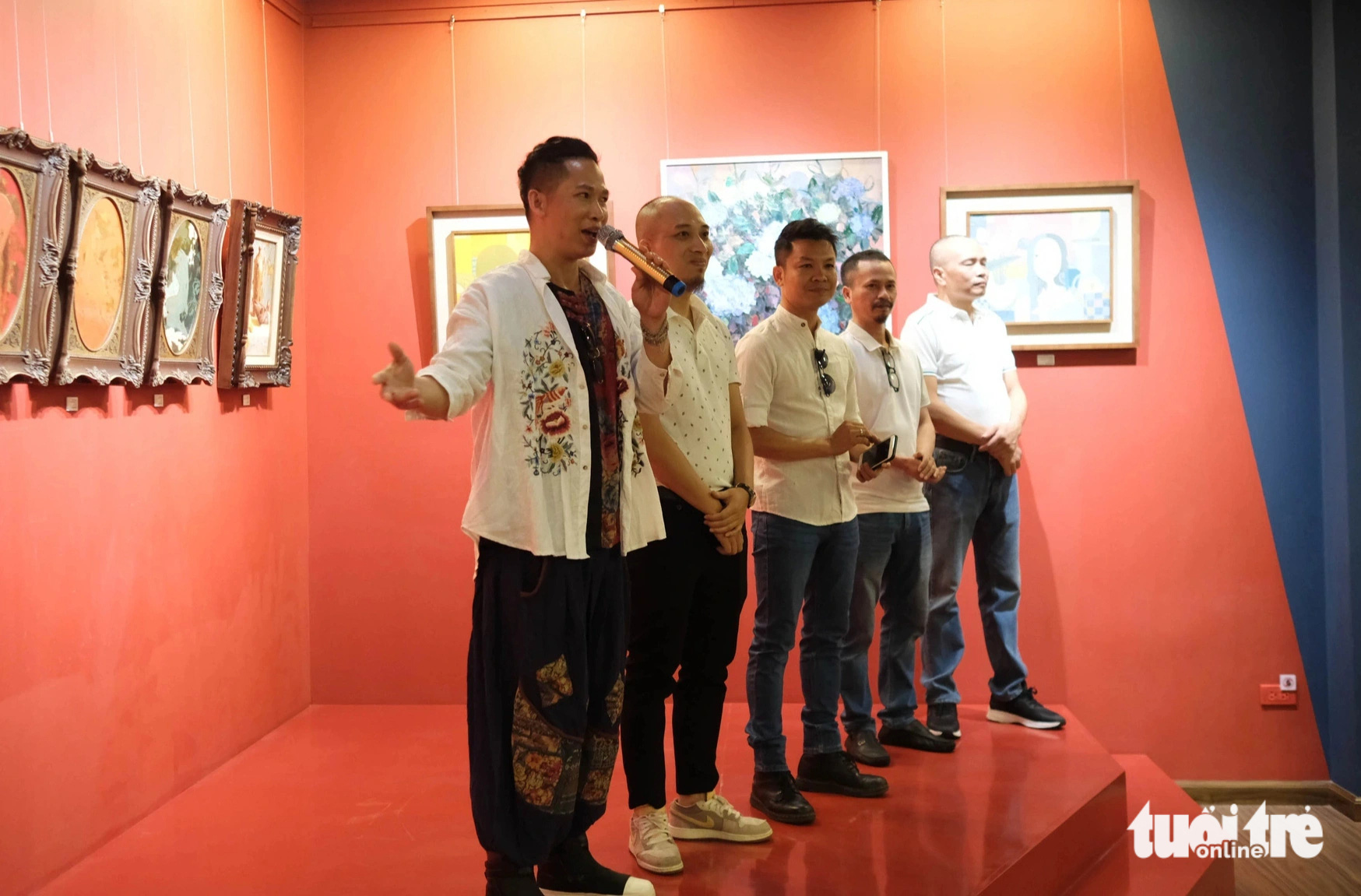 Năm họa sĩ Nguyễn Minh (Minh Phố), Lê Đức Tùng, Đặng Đình Ngỡ, Văn Quân và Lê Thế Anh tại triển lãm - Ảnh: M.V
