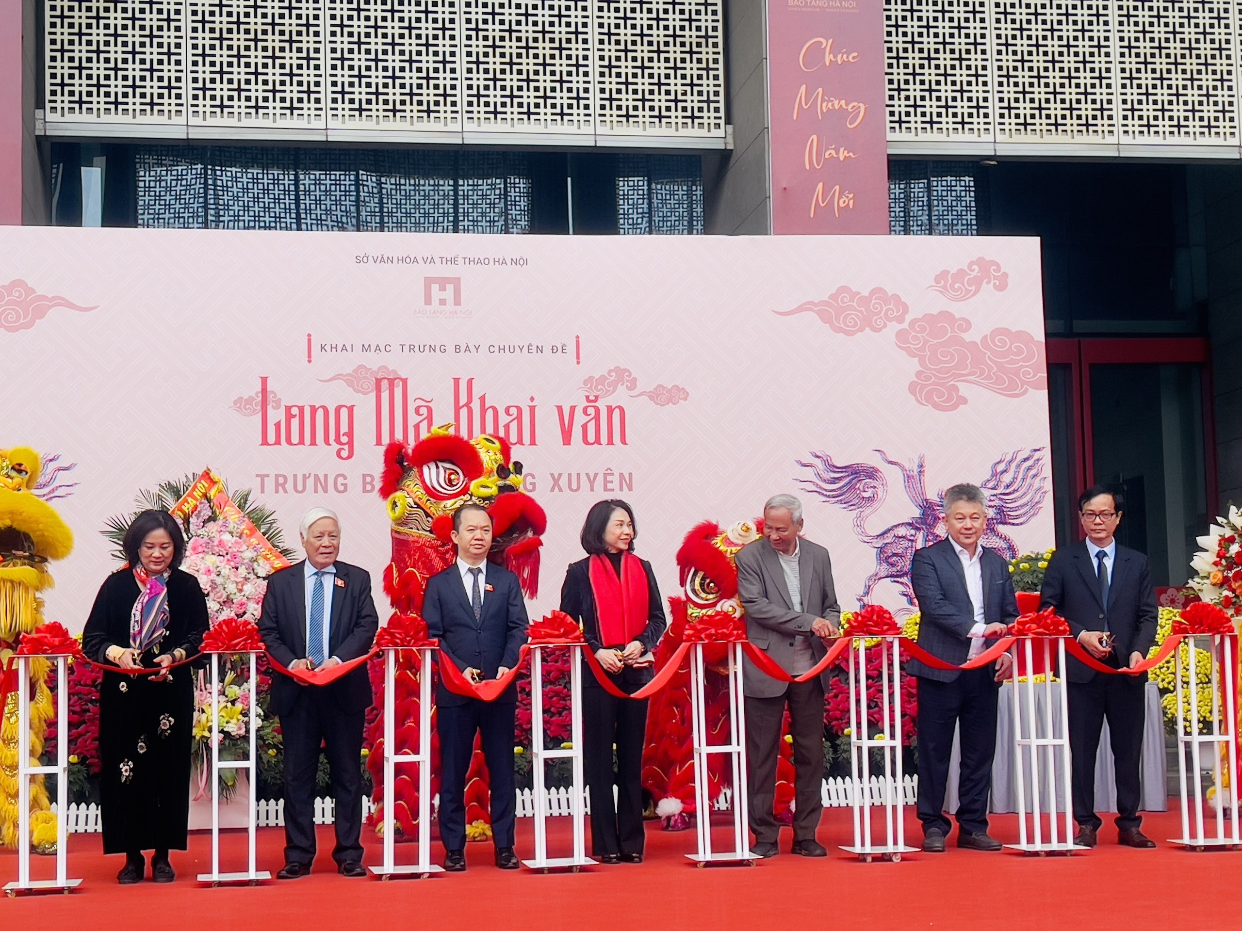 Các đại biểu cắt băng khai mạc trưng bày chuyên đề “Long Mã khai văn” mừng Xuân Bính Ngọ 2026. Ảnh: Tuyết Mai - TTXVN