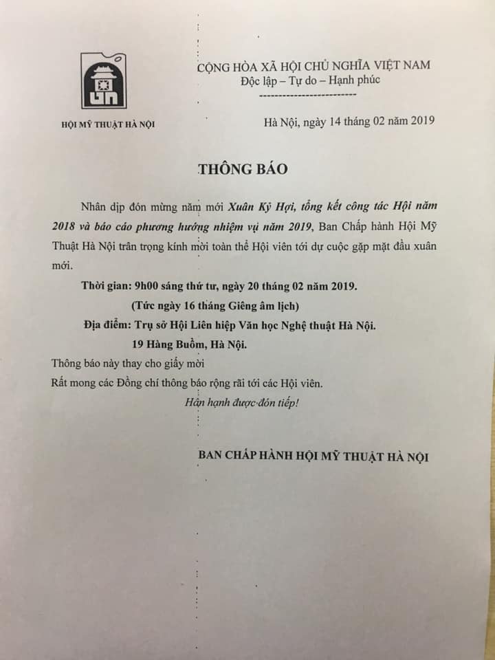 Trân trọng kính mời toàn thể Hội viên Hội Mỹ thuật Hà Nội về dự buổi họp mặt đầu xuân.