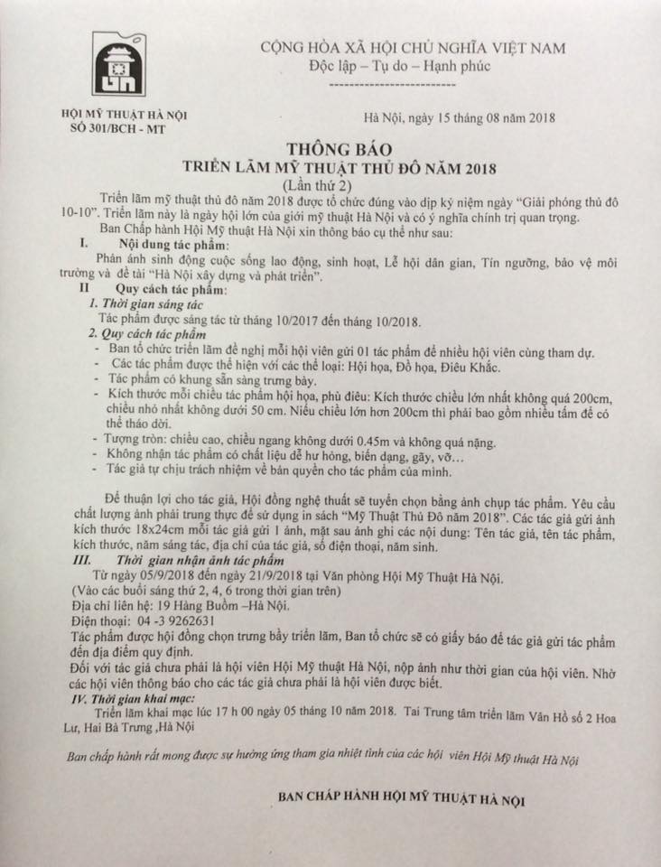 Trân trọng kính mời toàn thể hội viên và ACE Hoạ sĩ Hà Nội tham dự triển lãm Mỹ thuật Thủ đô 2018.