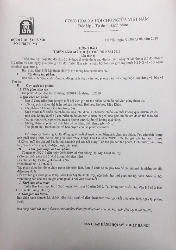 THÔNG BÁO TRIỂN LÃM MỸ THUẬT THỦ ĐÔ 2019