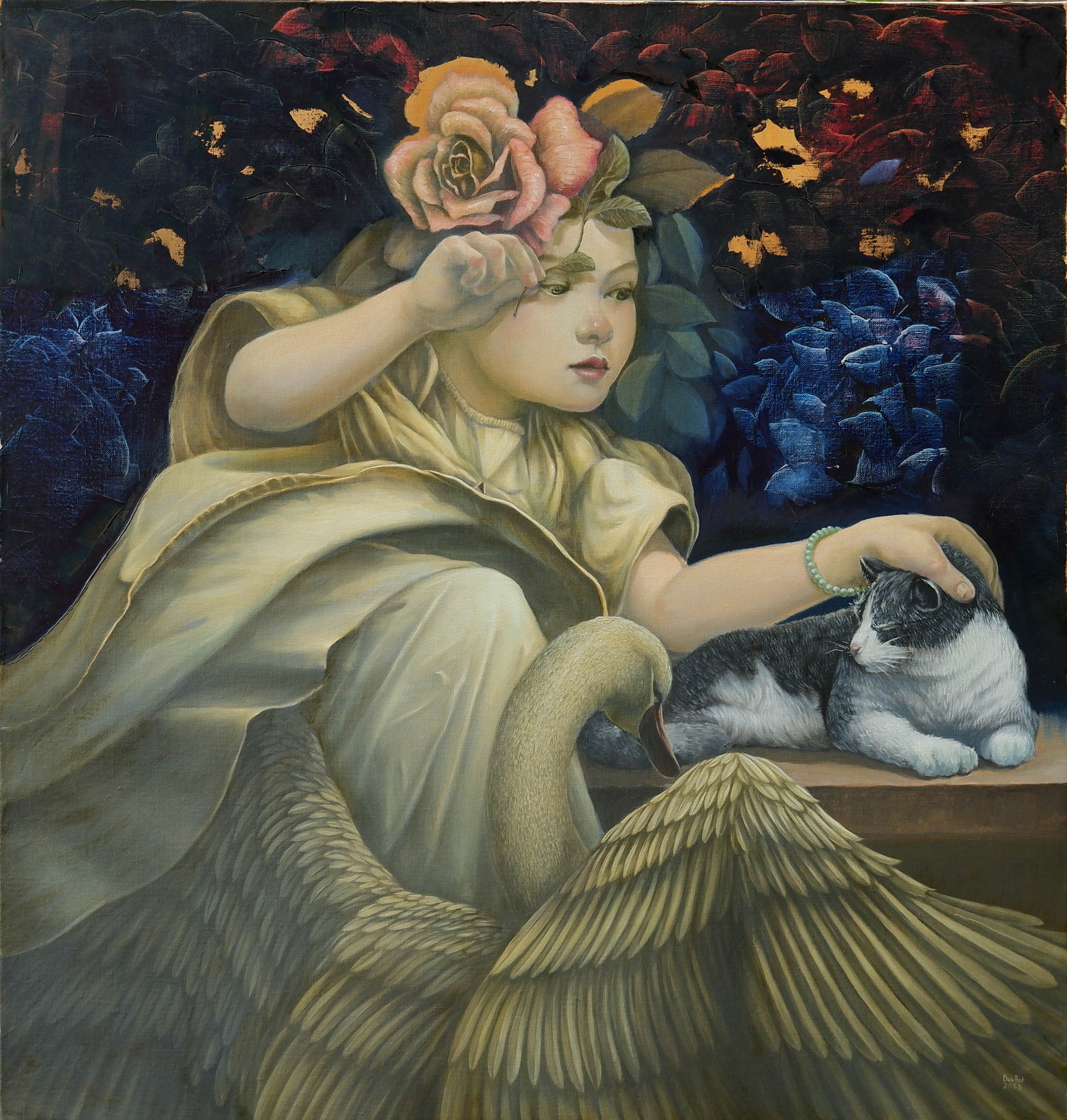 giai đoạn: sơ khai – ảo mộng – thăng hoa. Không gian tranh dày đặc chi tiết, tỉ mỉ, được vẽ trên khổ lớn, là sự kết hợp giữa yếu tố phi lý và chân thực. Những hình tượng như đôi bàn tay, ánh trăng, khu vườn lưu giữ ký ức về mẹ, vợ, con gái,… như giao thoa giữa hiện thực đời thường và thế giới nội tâm sâu lắng.